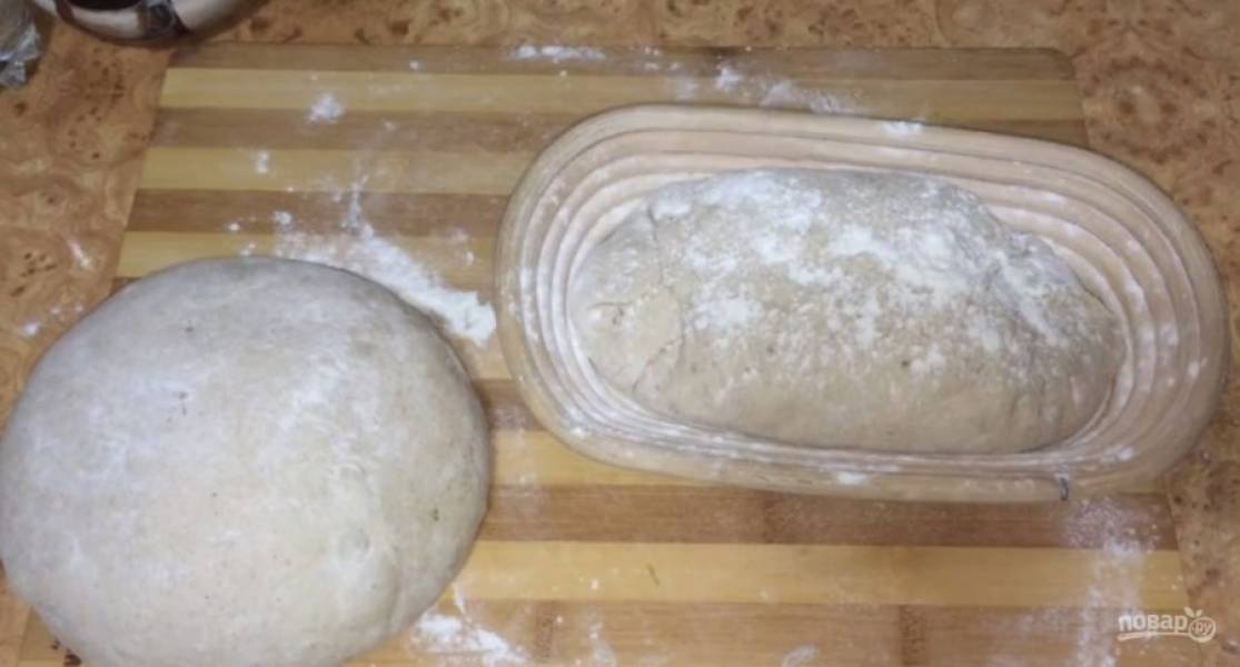 Выложите батон в корзинку для расстойки швом вверх и присыпьте мукой. Накройте пленкой и оставьте на 1 час. Аккуратно переложите хлеб на лопатку, стряхните кисточкой лишнюю муку и сделайте несколько глубоких надрезов.