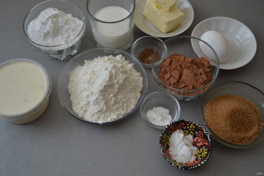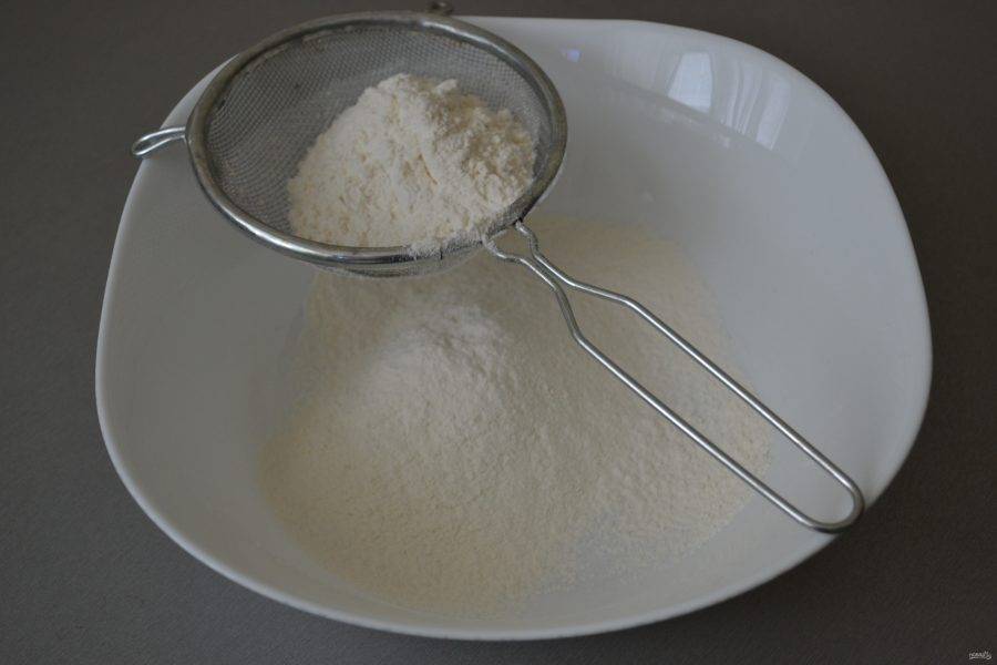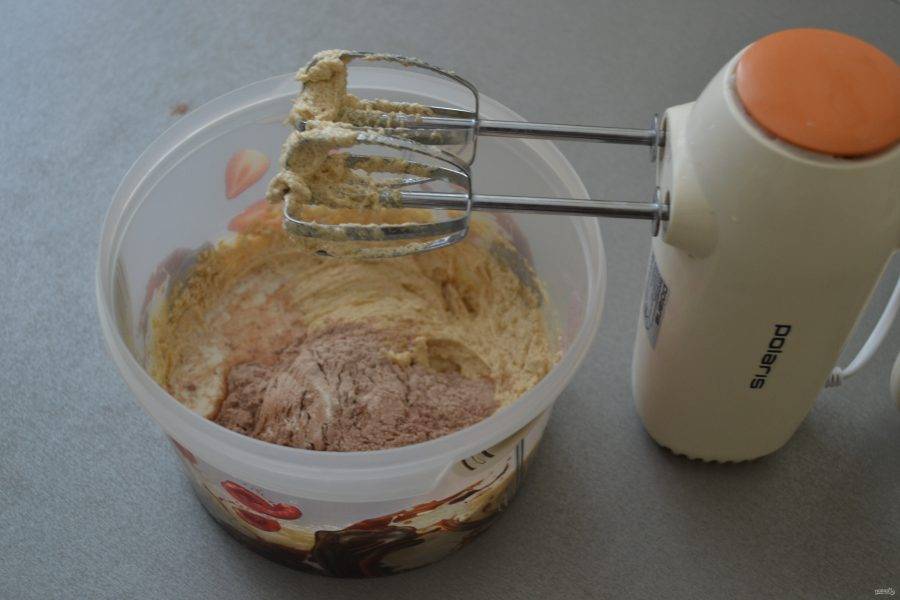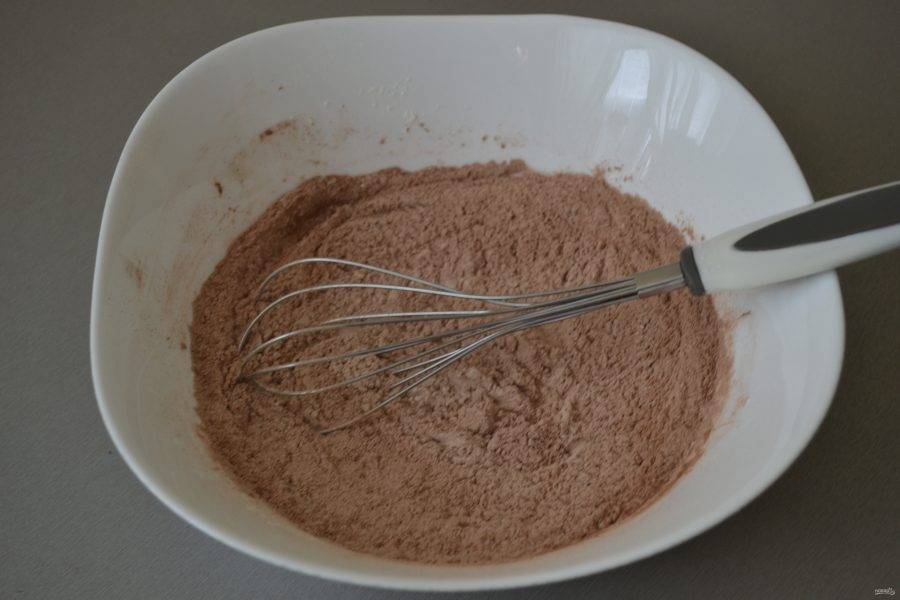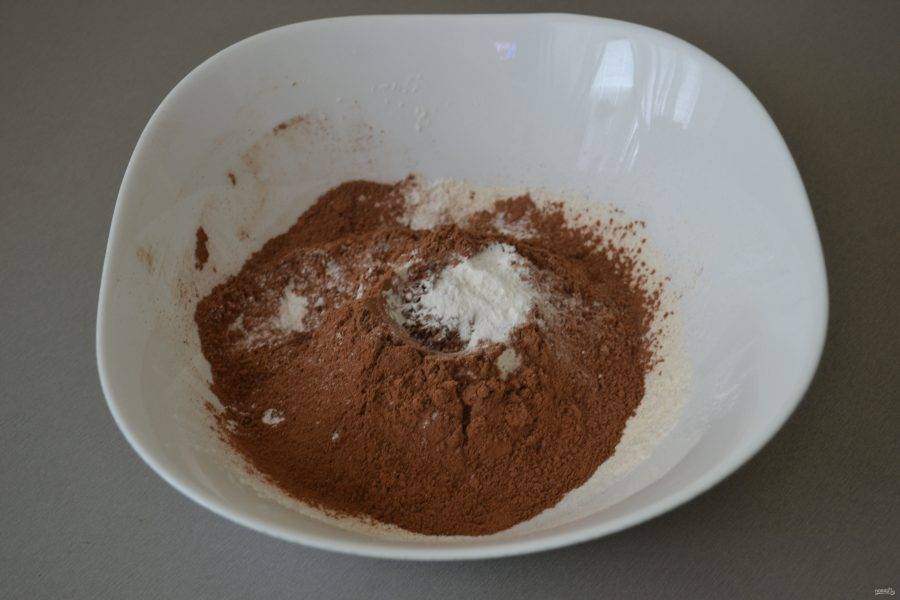 Добавьте в муку какао, растворимый кофе, разрыхлитель, ванильный сахар.