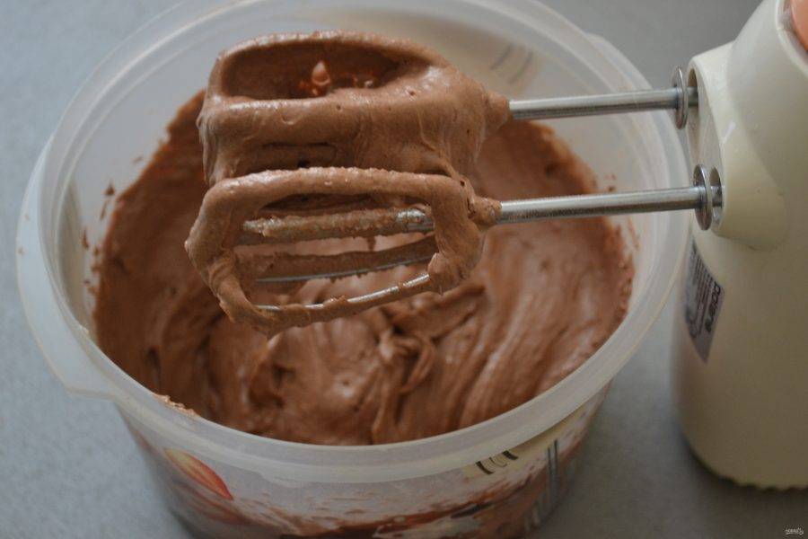Пока остывают бисквиты, приготовьте крем. Сливки взбейте с сахарной пудрой.