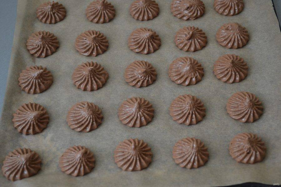 Тесто с помощью кондитерского мешка или ложки выложите на противень застеленный пергаментом. Выпекайте при температуре 180 градусов 10-12 минут.