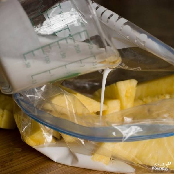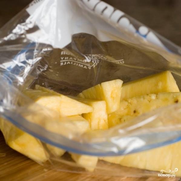 Складываем кусочки ананаса в плотно закрывающийся полиэтиленовый пакет.
