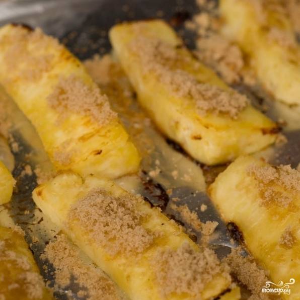 Посыпаем коричневым сахаром (опционально, если ананас сладкий - можно этого не делать), запекаем/жарим 2-3 минуты с одной стороны.