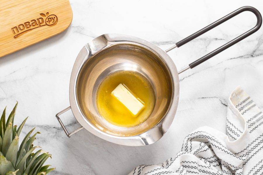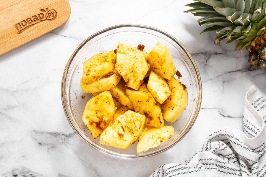 Полейте сладкой смесью с маслом ананасы и перемешайте, чтобы она равномерно распределилась по всем ломтикам.