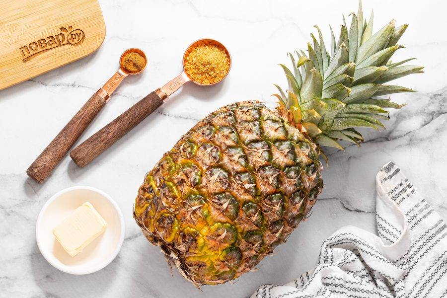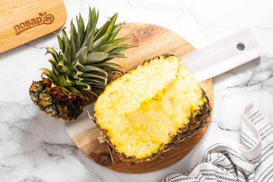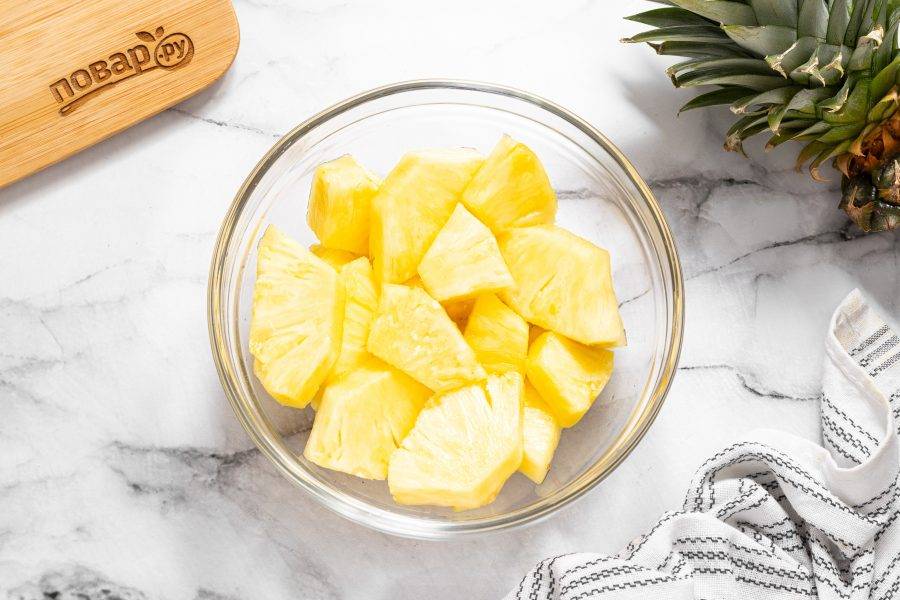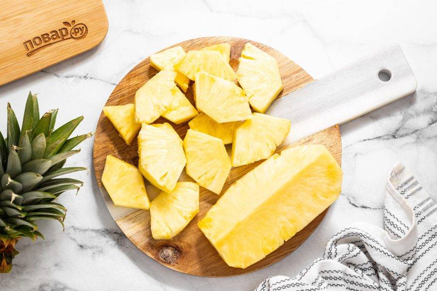 Ананас тщательно помойте, очистите от кожуры, отрежьте хвостик.