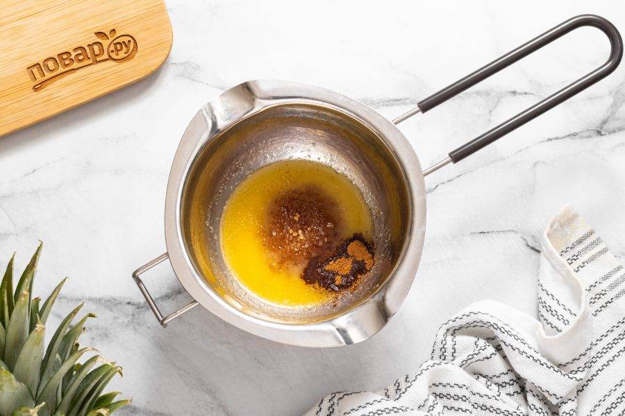 Добавьте в растопленное масло корицу и тростниковый сахар. Перемешайте.