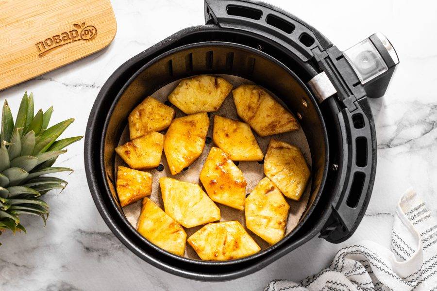 Разогревайте пару минут аэрогриль при температуре 200 градусов. Затем понизьте ее до 180. Выложите в один слой ломтики ананаса.