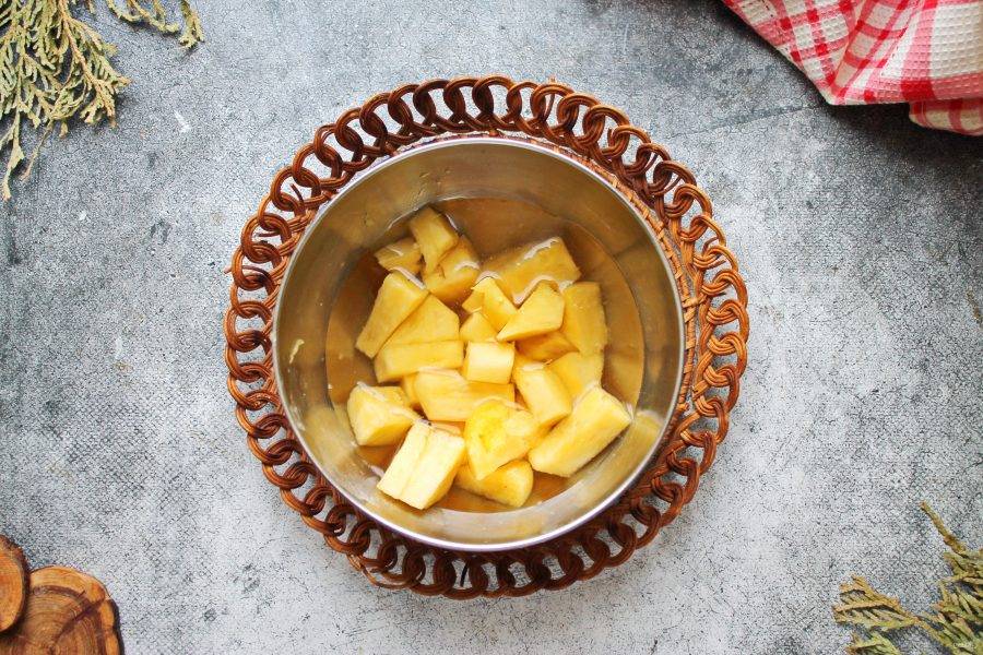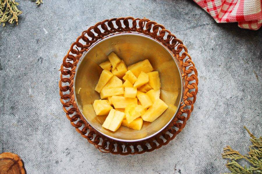 У ананаса отрежьте зеленую макушку, жесткую серединку и корку. Удалите из мякоти все глазки, которые не отрезались, и порежьте на кусочки.