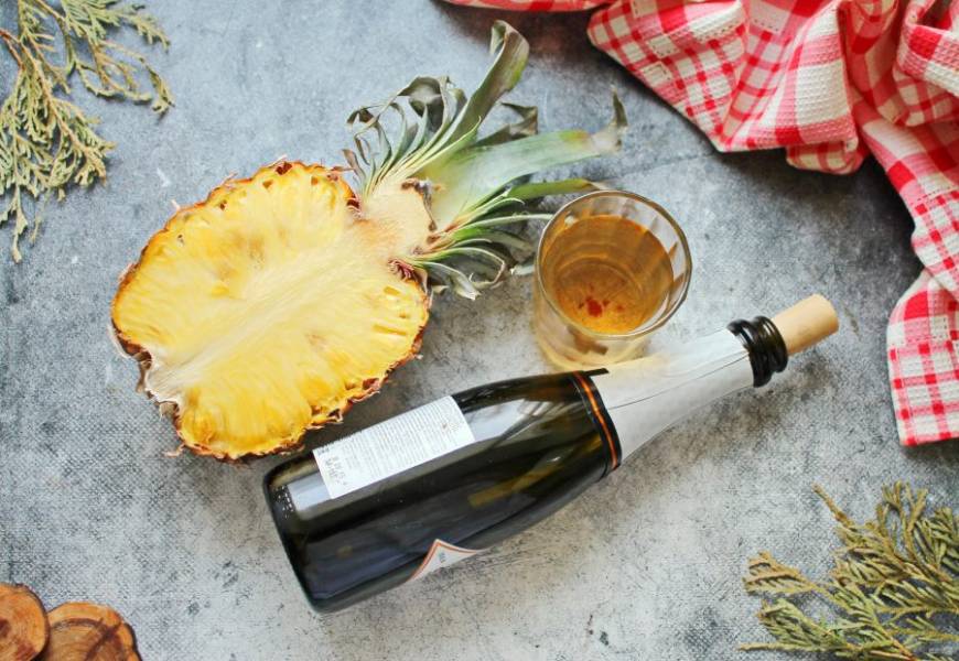 Подготовьте все необходимые ингредиенты для приготовления ананасового пунша с шампанским. Ананас вымойте и вытрите, белое вино и шампанское охладите.