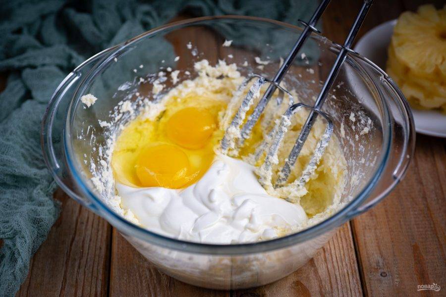 Ко взбитому маслу добавьте сметану и вбейте яйца.
