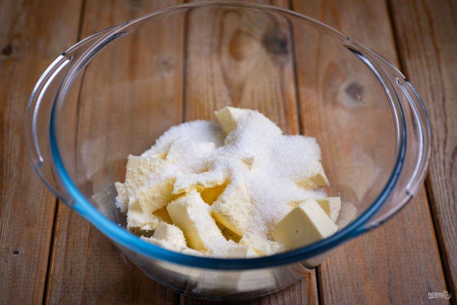 Приготовьте сначала тесто. В просторную миску выложите 120 грамм мягкого масла и добавьте 100 грамм сахара.