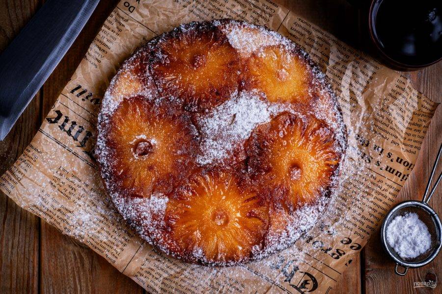 Форму застелите пергаментом для выпекания, выложите ананасы с карамелью.