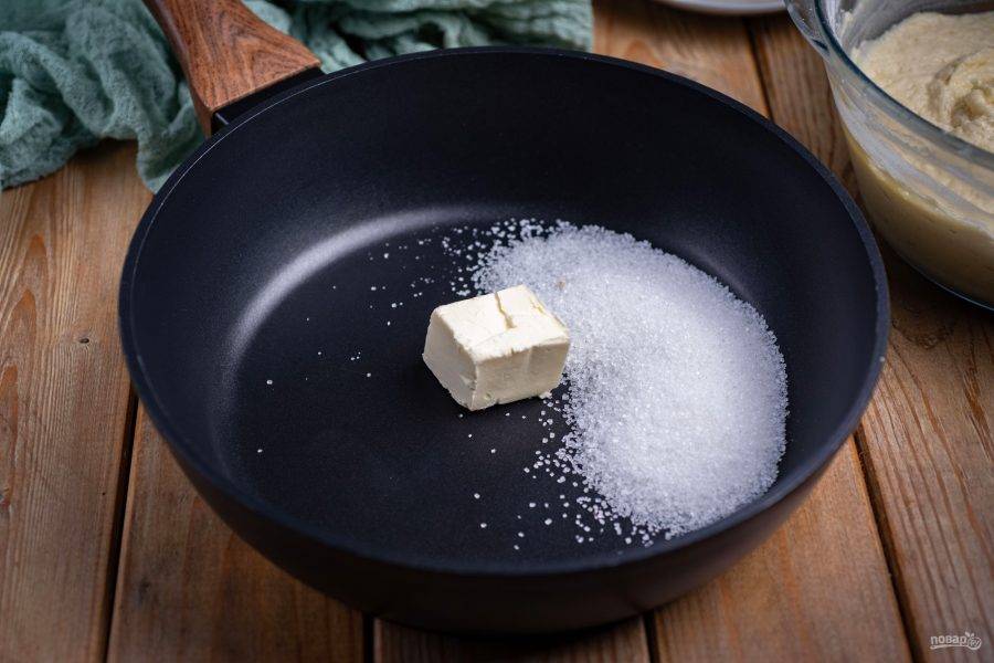 В сковороду выложите 60 грамм масла и добавьте 50 грамм сахара.