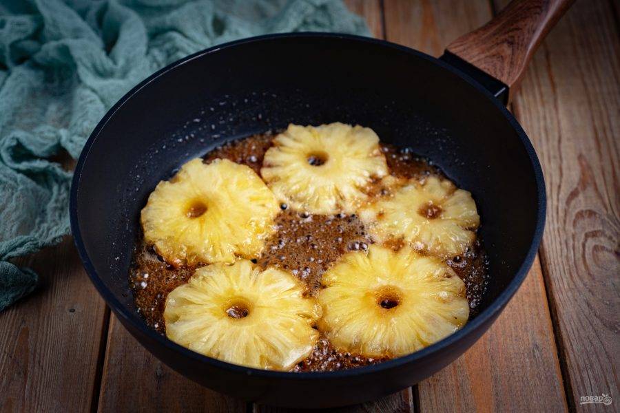 Готовьте ананасы до тех пор, как карамель станет коричневого цвета и тогда снимите сковороду с плиты.
