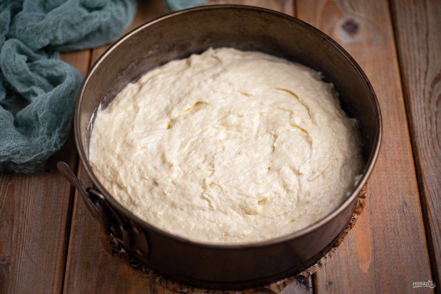 Поверх выложите тесто, разравнивая ложкой. Отправьте заполненную форму в заранее разогретую до 180 градусов духовку примерно на 40 минут.