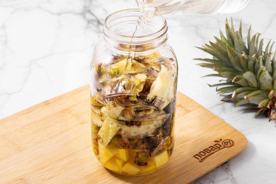 Для приготовления уксуса мы будем использовать только кожуру и сердцевину ананаса. Переложите их в чистую стерилизованную банку.