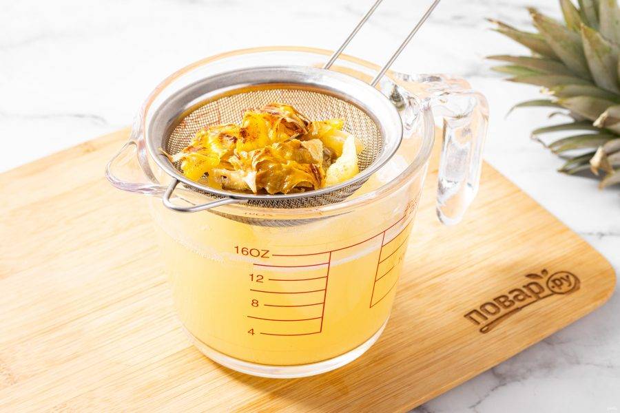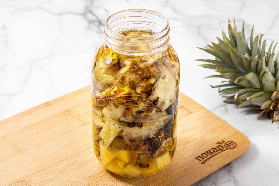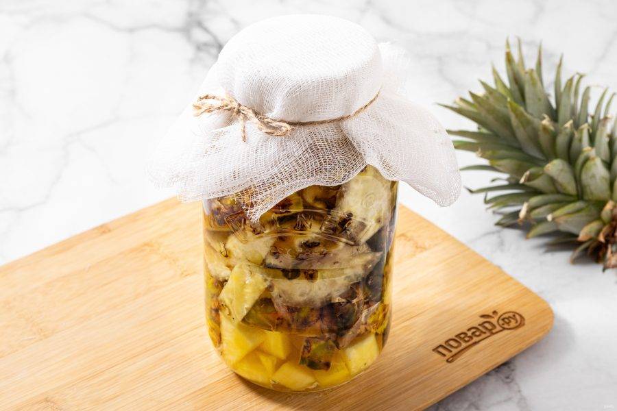 Каждый день открывайте банку и перемешивайте содержимое деревянной ложкой. Кожура и сердцевина ананаса осядут, станут мягче, начнут пениться и бродить.