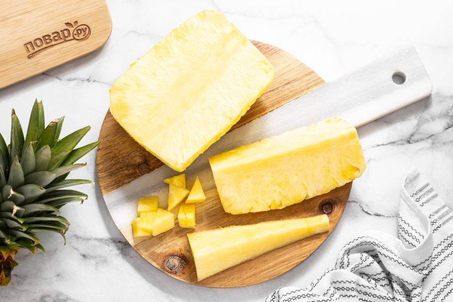 У ананаса вырежьте жесткую сердцевину и нарежьте ее кубиками среднего размера.