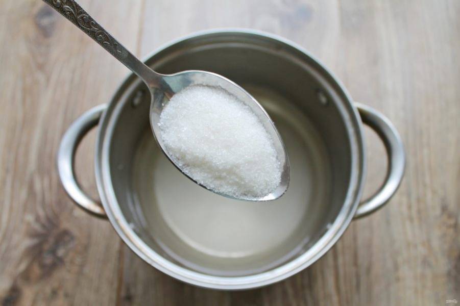 В кастрюлю налейте воду, всыпьте сахар и доведите до кипения на среднем огне в течение трех минут.