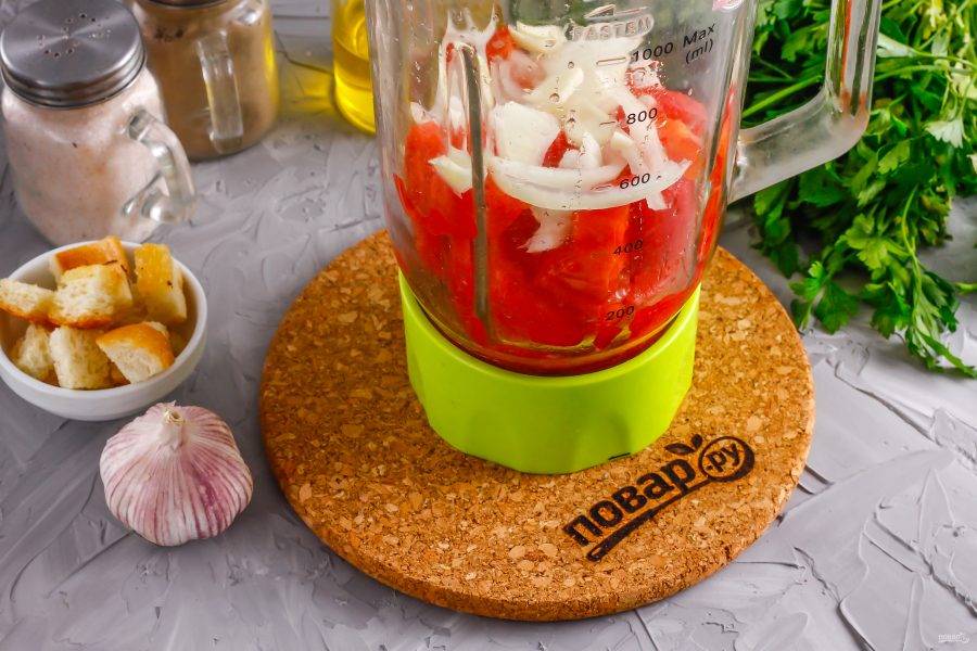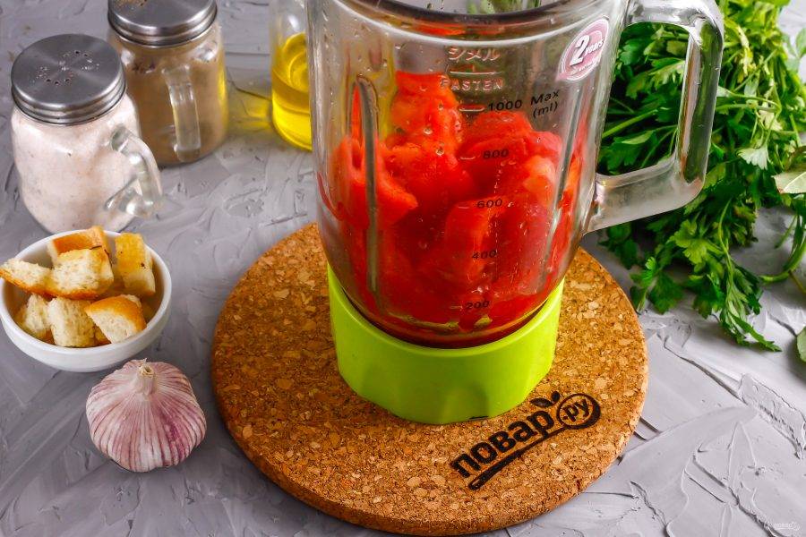 Ароматный андалузский суп подается к столу холодным, поэтому готовьте его и охлаждайте в холодильнике примерно за 1 час. Лучше всего использовать помидоры сочных сортов, а не мясистых, удаляя кожуру.