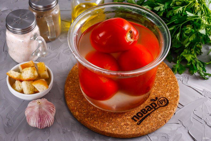 Помидоры промойте в воде, выложите в глубокую емкость и залейте кипятком. Оставьте на 10 минут для пропаривания, затем переместите в холодную воду. Очистите кожуру и удалите, вырежьте зеленые сердцевинки.