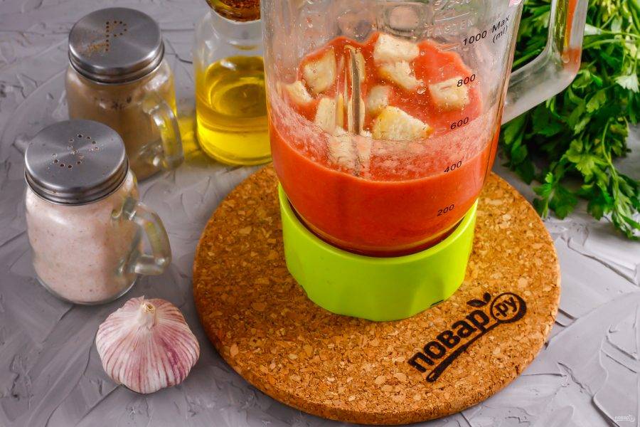 Всыпьте соль и молотый черный перец. Измельчите все на пульсирующем режиме в течение 3 минут. Затем в емкость добавьте сухарики или кусочки багета. Оставьте на 5 минут, чтобы они разбухли. Затем снова все измельчите в течение 2-3 минут.