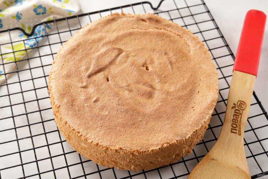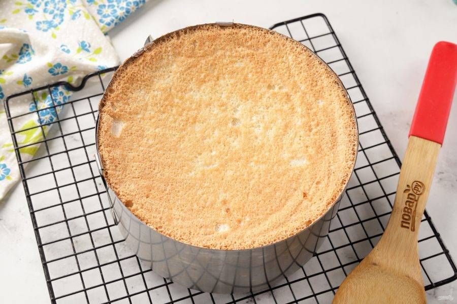 С помощью ножа вырежьте его из формы. Бисквиту обязательно нужно дать отлежаться. Оберните его пищевой пленкой и отправьте в холодильник на 6 часов, а лучше на ночь. Бисквит на белках можно приготовить заранее, он хранится в холодильнике до недели, а в морозильной камере до месяца. Главное, герметично завернуть его в пищевую пленку.