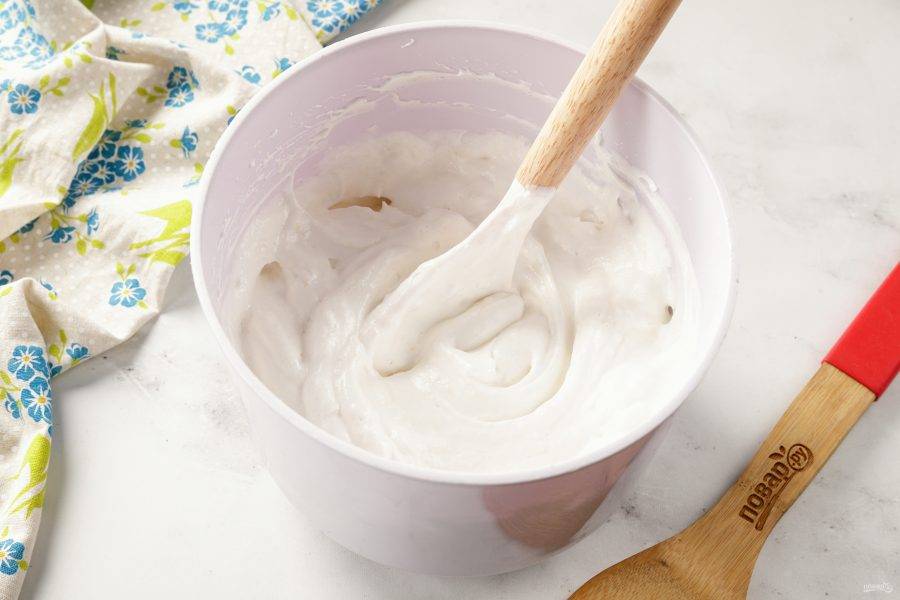 Проверяйте, чтобы вся мука объединилась с белками и не осталось непромешанных участков. Вот такое, довольно густое тесто, должно получиться.