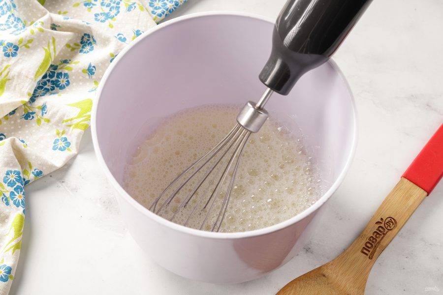 Когда появится пена, в несколько заходов добавьте сахар.