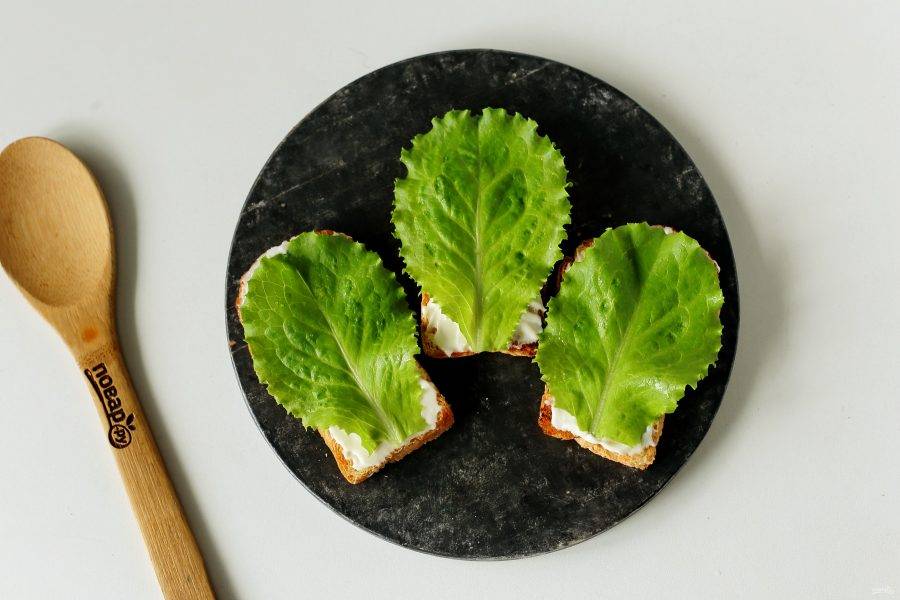 Оставшиеся кусочки хлеба смажьте сливочным сыром и накройте начинку сверху.