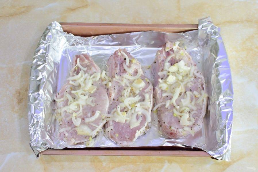 Для запекания застелите противень фольгой. Выложите антрекот на фольгу. Разложите лук из маринада.