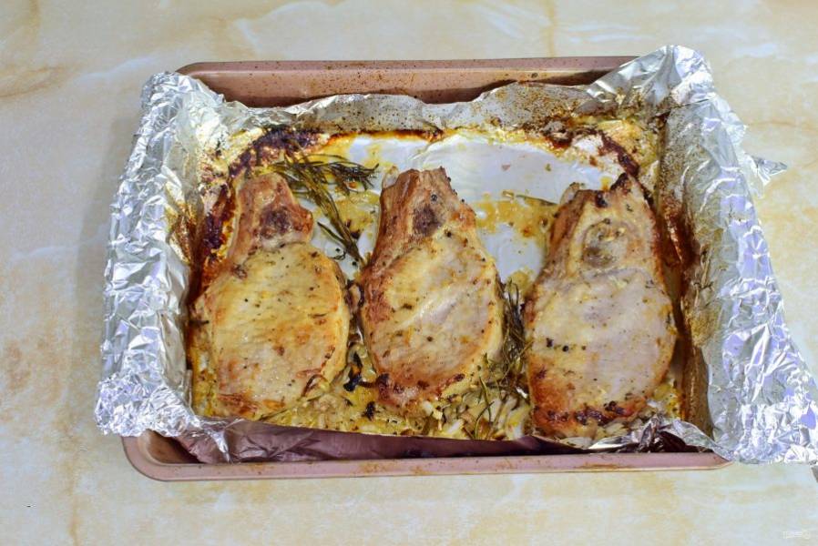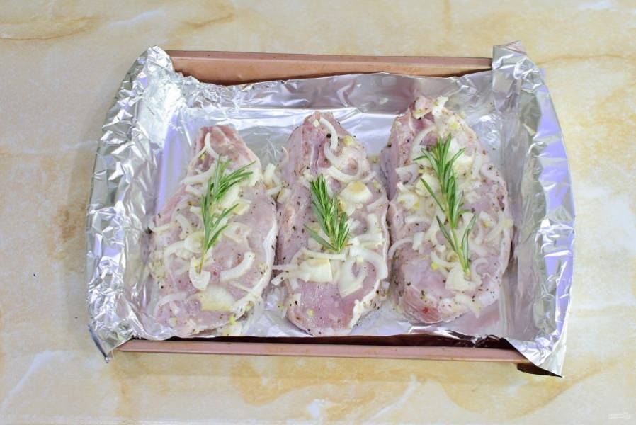 Сверху на каждый кусок мяса выложите веточку розмарина. Закройте еще одним листом фольги и поставьте в духовку, предварительно разогретую до 180 градусов, примерно на 40-50 минут. Ориентируйтесь по своей духовке.