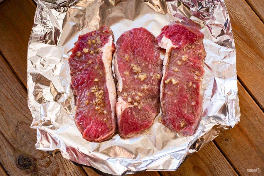 Сложите в два слоя пищевую фольгу, чуть поднимая края, и выложите поверх замаринованные куски говядины вместе с маринадом.
