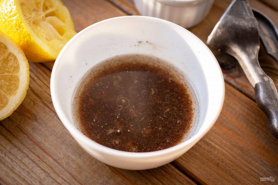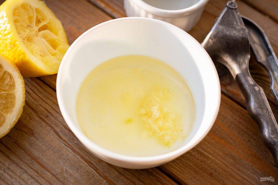 В мисочку выдавите необходимое количество сока из свежего лимона, добавьте оливковое масло и выдавите через чеснокодавилку зубчики чеснока. Перемешайте.
