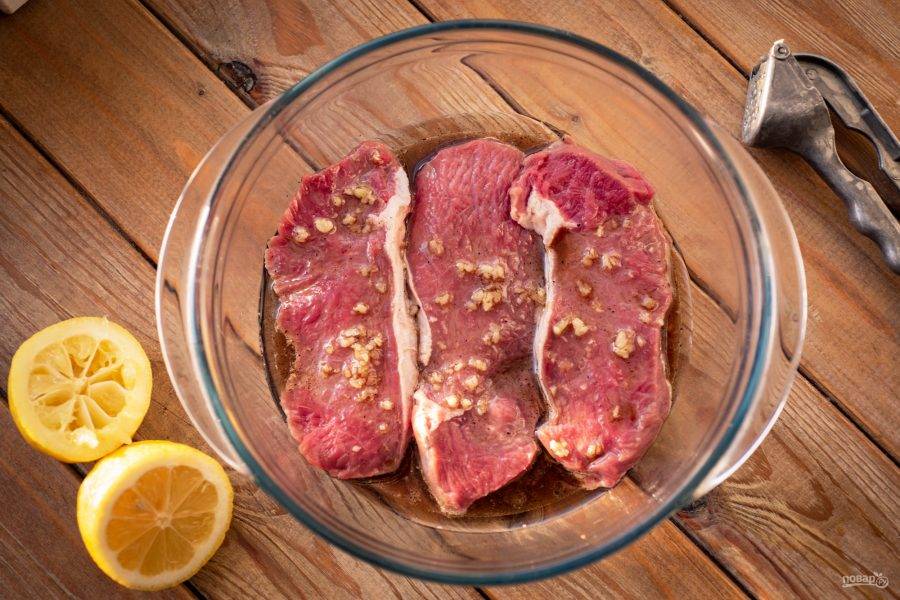 Выложите в просторную емкость говядину и обильно полейте приготовленным маринадом, отправьте в холодильник на 2 часа мариноваться.