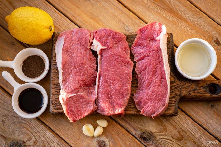 Все ингредиенты выложите на стол перед началом процесса. Чесночные зубчики почистите. Говядину ополосните и просушите бумажными полотенцами.
