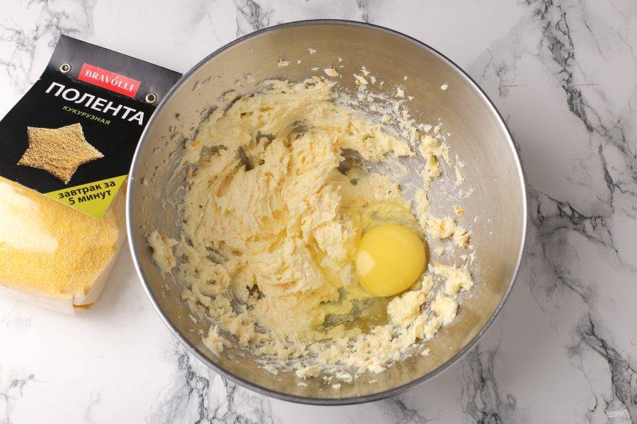 Размчягчённое сливочное масло взбейте с сахаром, ванилином и апельсиновой цедрой. Добавьте яйцо.