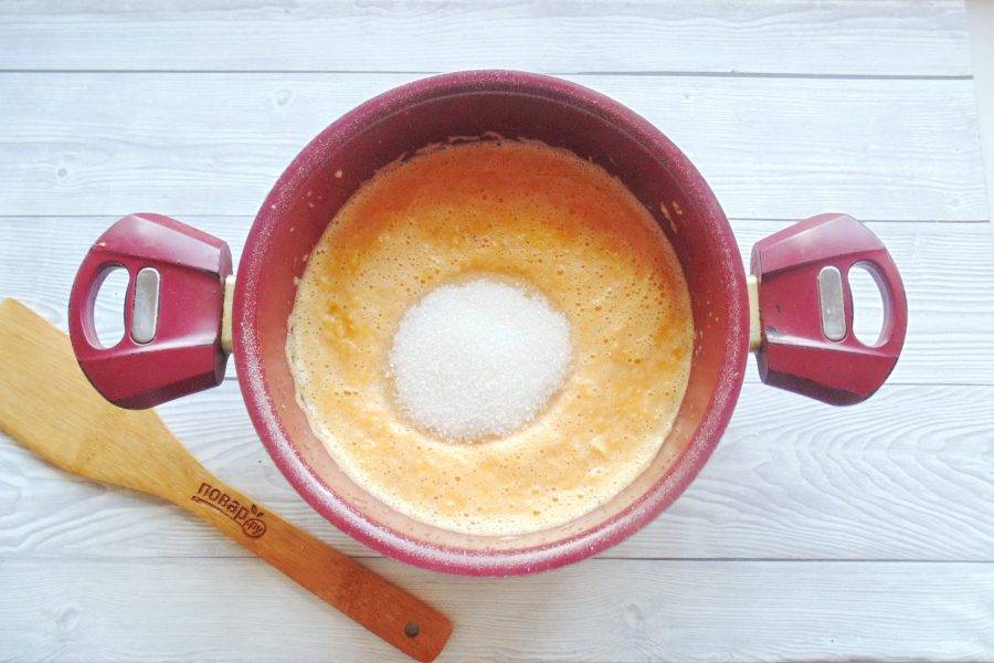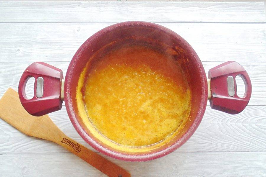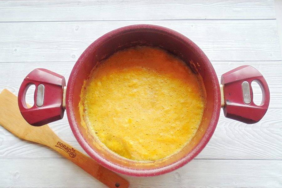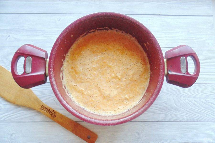 Переложите цитрусовые в кастрюлю с толстым дном и взбейте блендером до однородности.