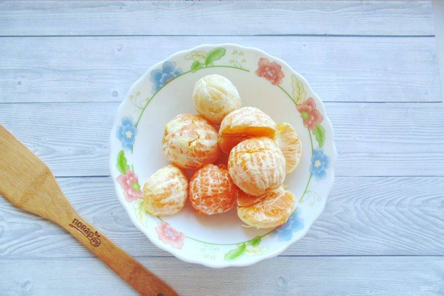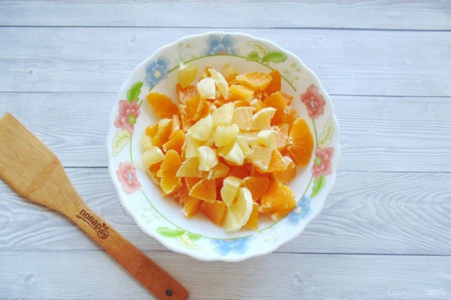 Апельсины и лимон очистите от кожуры. По возможности максимально удалите белые пленки.
