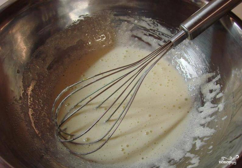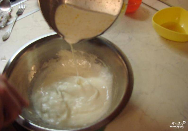 Все время помешивая в яичные желтки, тонкой струйкой влить молочную смесь.