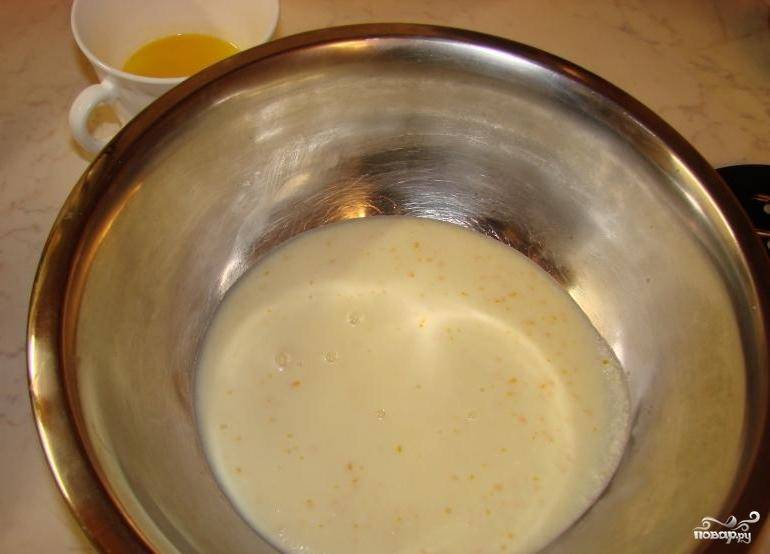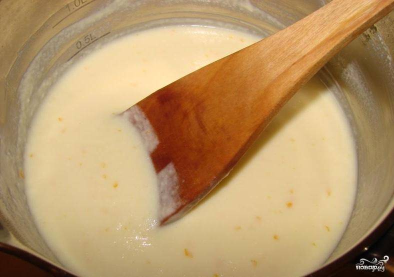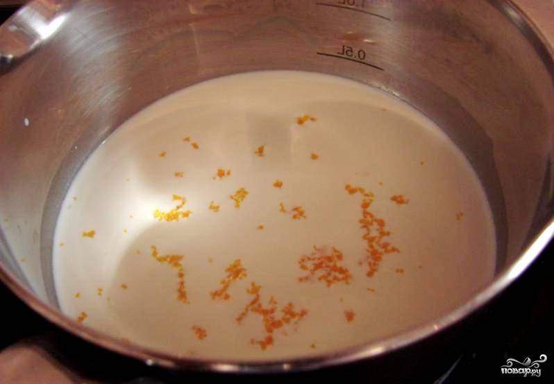 В кастрюлю влить молоко и сливки. Добавить цедру апельсина и поставить на средний огонь, варить около 5 минут, пока не начнут появляться маленькие пузырьки.