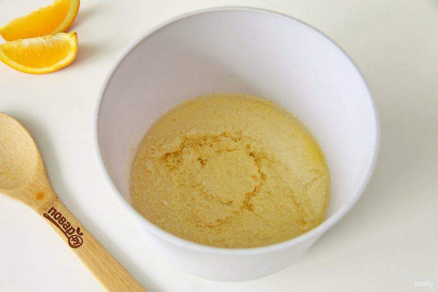 В глубокой миске соедините апельсиновый сок и манку. Перемешайте.
