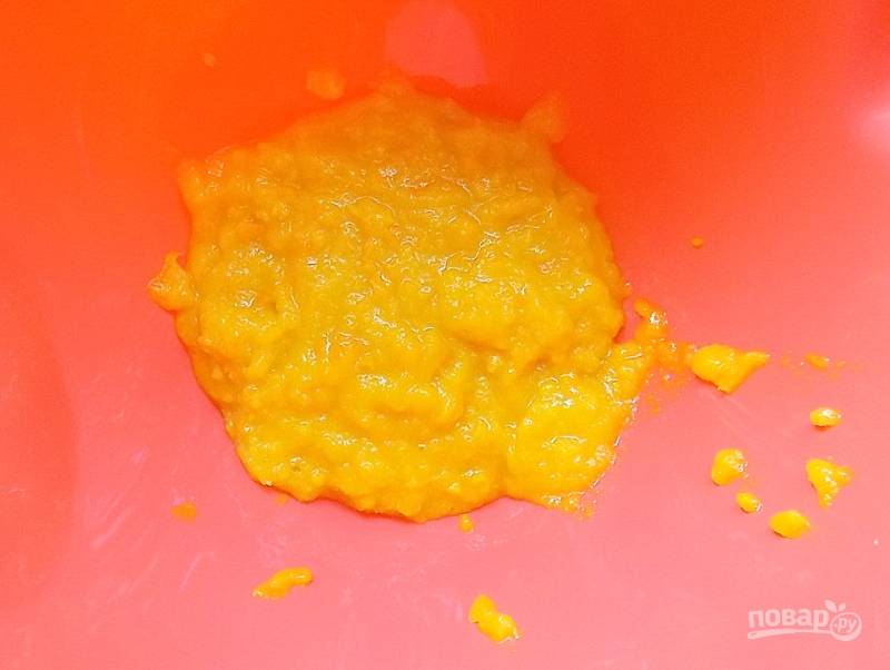 Вымойте тщательно апельсин. Порежьте его на дольки, удалите семечки. Измельчите с помощью блендера до однородного состояния.