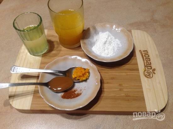 4. А теперь нам понадобятся вот эти ингредиенты: апельсиновый сок, бульон, мед, цедра, паприка и кукурузный крахмал. Если у вас нет бульона, замените его водой.