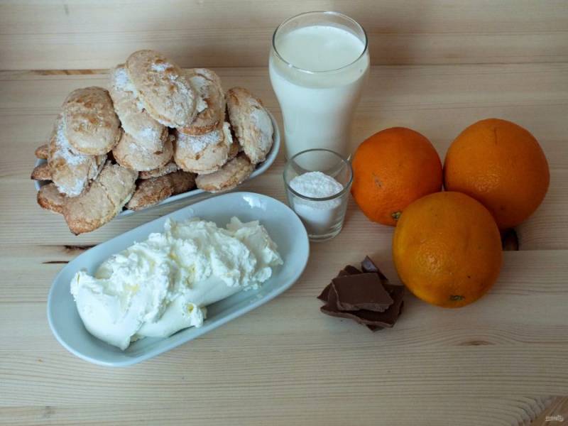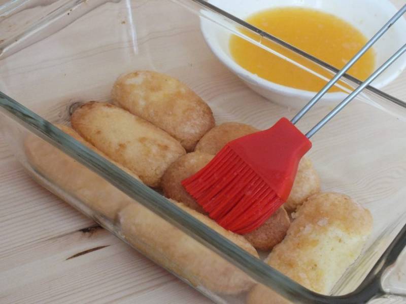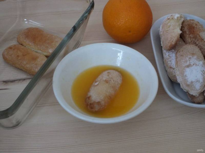 Возьмите глубокую прямоугольную форму. Печенье савоярди поочередно обмакните в апельсиновый сок и выложите им дно формы.