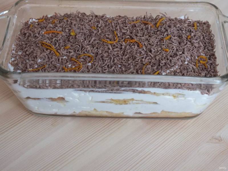 Верх посыпьте тертым шоколадом и тонкой стружкой из цедры апельсина. Поставьте тирамису в холодильник, минимум на 4 часа.