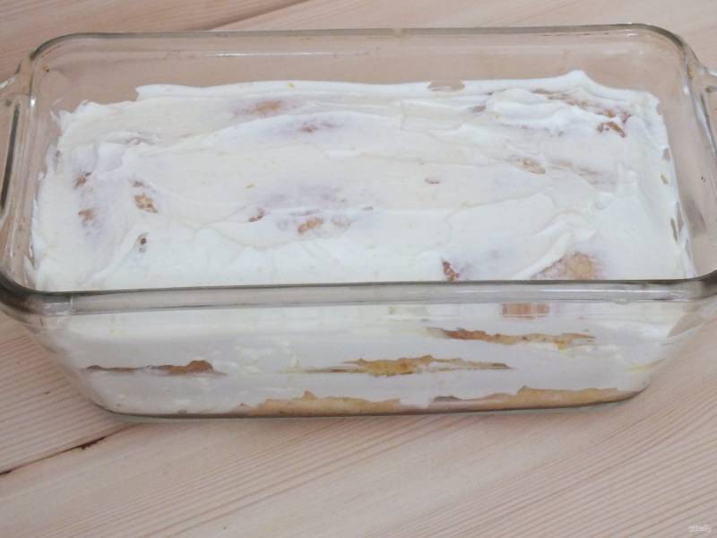 На савоярди выложите слой крема, сверху опять выложите печенье (не забудьте обмакнуть в апельсиновый сок) и повторите слои.
