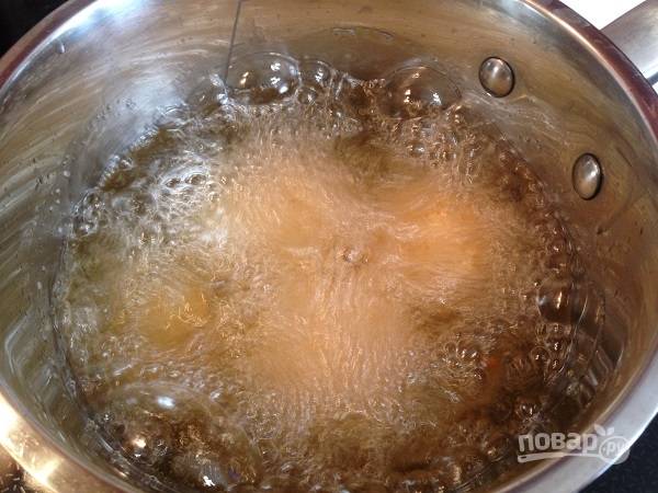 12. Разогреваем на огне чуть больше среднего растительное масло, опускаем в масло по 3-4 шарика-аранчини (или обжариваем во фритюрнице).