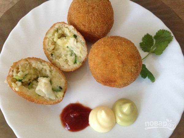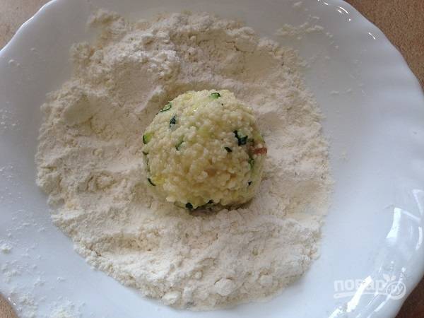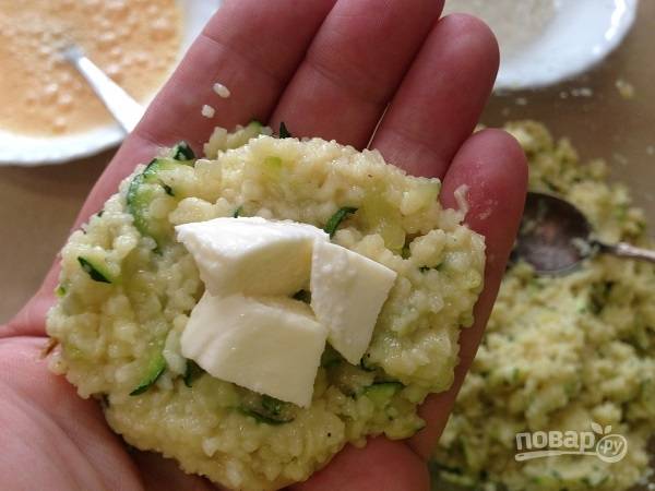 7. Из массы с кускусом формируем лепешку (чуть меньше столовой ложки), в центр выкладываем моцареллу. Формируем шарик.