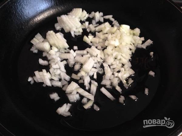 2. Луковицу очистим и мелко нарежем, обжариваем с ложкой растительного масла до легкой золотистости.