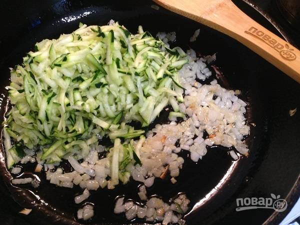 3. Добавим к луку цукини, натертый на крупной терке. Солим и перчим по вкусу, обжариваем минуты 3-4. Затем остужаем.